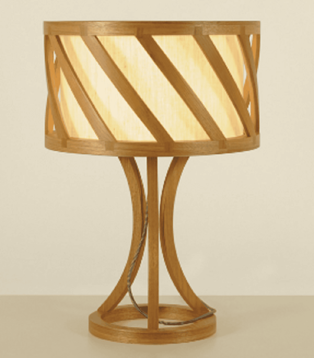 Abajur com estrutura e cúpula de freijó. Fechamento interno de linho cru.