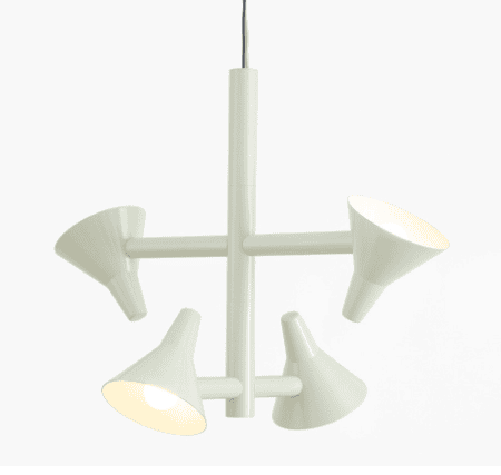 Pendente composto de diversos refletores recortados e combinados, a luz emana das aberturas onde se unem as peças. Em latão polido com branco ou alumínio colorido.