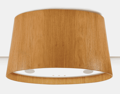 Plafon de madeira certificada freijó com estrutura de alumínio off white e fechamento de acrílico leitoso fosco.