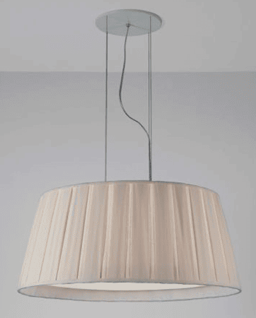 Pendente com estrutura de alumínio e cúpula de tecido de algodão branco, preto, cru ou vermelho com prega macho. Fechamento inferior de