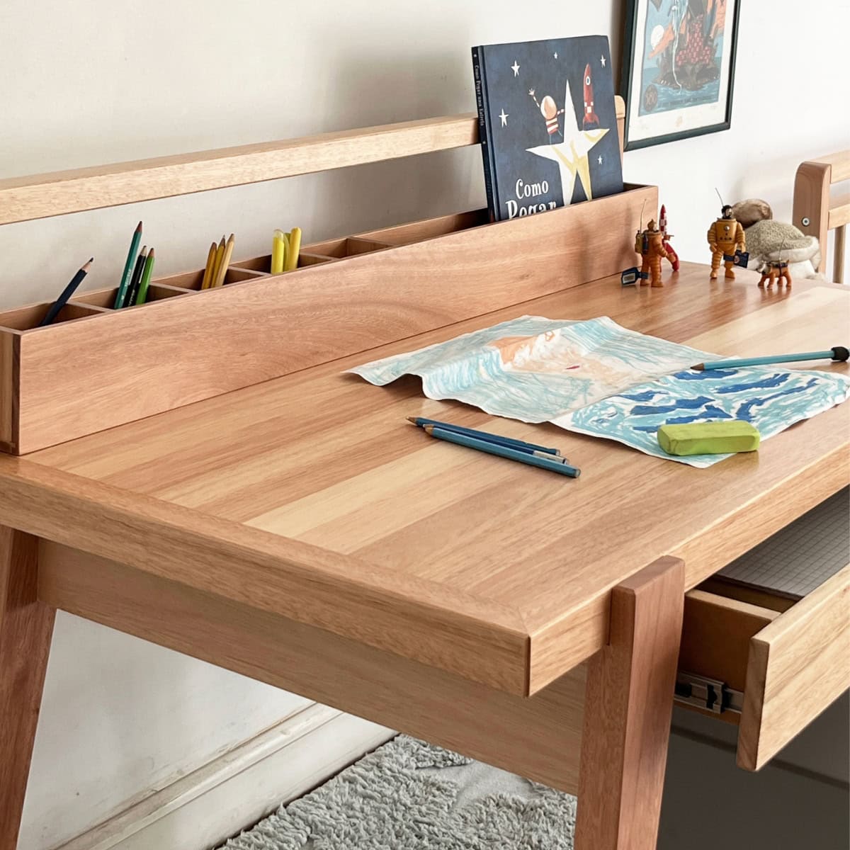 A escrivaninha tem design moderno e funcional com seu grande porta-lápis e livros e gaveta.